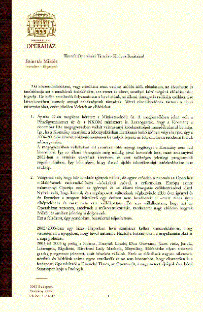 2. Világossá vált, hogy bár konkrét igények nélkül, de egyre erősebb a nyomás az Operaház működésének racionalizálására �közkeletű szóval, a reformokra. Európa szinte valamennyi Operája ezzel az igénnyel és az állami támogatás csökkentésével küzd. Nyilvánvaló, hogy komoly és megalapozott változások véghezvitele több évet igényel és én ilyeneket a magam hátralevő egy évében nem kezdhetek el �mert nincs ilyen elképzelésem és mert nem erre vállalkoztam. Én arra vállalkoztam, hogy azt az Operaházat vezetem, amelynek a műsorstruktúráját, szerkezetét nagy elődeim hagyták örökül, és amiben jelenleg is dolgozunk.
