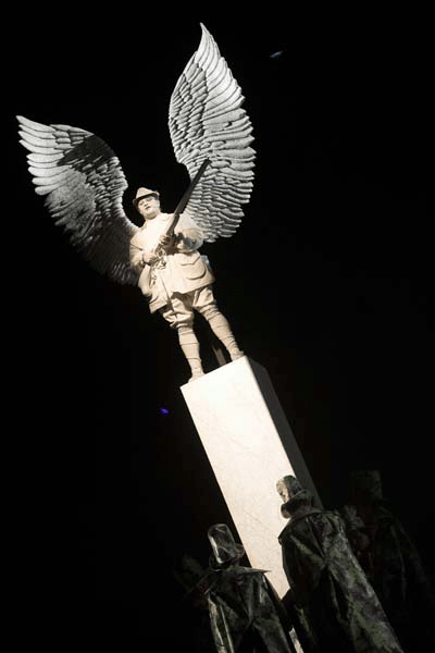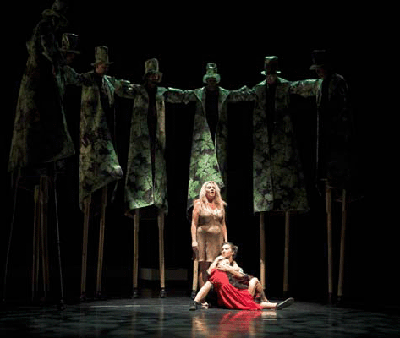 Az erdőt hosszú zöld kabátot öltött, cilinderes gólyalábasok jelenítik meg. Hórihorgas erdei lidércek, az út emberforma szemtanúi. Vonulásuk impozáns látvány: áramlanak ki és be, körben állva tipegnek és imbolyognak termetükhöz képest pálcikának tetsző lábaikon. A farkasok eredendő közege nem az erdő, ösztöneik sodorják őket a vadonba. Ők már végigjárták az utat, ám az erdőt senki nem hagyhatja végleg maga mögött. A táplálék, a másik nem, a szexuális aktus utáni vágy mágnese (az életösztön) vonzza őket újra és újra a sötétségbe. A fehér és fekete színszimbolikája mindvégig jelen van az előadásban. A vadont levegőben függő csonka oszlopon állva őrzi a talpig fehérre maszkírozott, angyalszárnyas vadász (Csapó József). A Márkos Albert által szerzett operaáriákat zengi (olykor Ágenssel kiegészülve). Mindenek és mindenki felett áll - a kifejezés szó szerinti és átvitt értelmében egyaránt. Az állati én felett őrt álló feddhetetlen és kérlelhetetlen csősz. Nem a szubjektum szemszögéből, hanem egy felső és isteni (helyesebben: az isteni álruhájába bújt bigott emberi) értékrend szerint ítél. A nagy vadász a bennünk levő fék és korlát. Jelenléte szükséges, de nem kívánatos. Ezért eshet meg, hogy a mesével ellentétes módon itt a vadász helyett a farkasokkal rokonszenvezünk. A hét farkas, a hét táncos mutatványait a közönség (álljon felnőttekből vagy gyermekekből) több ízben tapssal jutalmazza. Megkérdőjeleződik a jó és rossz egyértelműsége. A farkasság állapot, az én irányíthatatlan, rémítően is vonzó oldala. A személyiség tehát három összetevőből vegyül: vadász, farkas és a kettő között feszülő kötélen egyensúlyozó Piroska. Miután a vadász kivégzi a hét farkast, a háttérben egy meztelen férfi szökell a magasba: vakítóan villogó stroboszkóp merevíti jelenéssé megfeszített, keresztforma alakját: ecce homo, íme a farkasban rejlő ember és az emberben rejlő farkas.