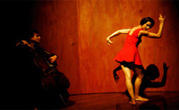 A képzőművészeti installációként is értelmezhető díszlet hajlított falakból, fényből és tüllökből álló sarkában ül csellójával a zenész, hangokból építve fel a világot, mely végül tökéletes szintézist alkot a látvánnyal és a koreográfiával.