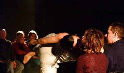 A holland koreográfus asszony Stau című produkciójában a párba rendeződő elemi részecskéket emberi világra, nézőkre és táncosokra váltja. Van Dijk először is, mint az est játékmestere bemutatja egymásnak az est résztvevőit: nézőknek a játszókat. Közönségként négyzet alakban felállított széksorokban kapunk helyet, s a négyzetbe lép be a piros és a fehér pólós lány (Nina Wollny és Birgit Kunzl). Szorosan állnak egymással szemben, s a testük visszafogott rezdítéseiből indulva töltik ki a rendelkezésükre álló, szűk terepet egyre lendületesebb és szélesebb mozdulatokkal. Improvizatív benyomást keltő mozgássoruk piszkálja a békés nézői szemlélődést is. Nyitányként a piroska átbújik, átcsúsztatja magát az egyik néző széke alatt, miközben keresi a szemkontaktust a széken ülővel, s ugyanez több ízben ismétlődik és variálódik, hol az egyik, hol a másik lány csusszan ki vagy be valaki alatt. Tánc közben pedig olyan közel kerülnek hozzánk, hogy lehet követni az izzadságfoltok terebélyesedését, hallani a zihálást, amire zsongásszerű zörejzenét terít egy fenti erősítő. A mozdulatok egyre bátrabban kerülnek közelebb hozzánk. Elénk dőlnek és rogynak a táncosok, s a földről úgy mozdítják tovább magukat, hogy a térdünkre teszik a talpukat, vagyis a mi testünk segítségét veszik igénybe a saját mozdulatukhoz. Egy másik résznél sorban egymás után hajolnak a nézők elé. Először csak széttárt ujjaik mögül néznek az arcokba, de ez fokozódik, egyre gyorsabb és vadabb hajlongásba vált, végül az utolsó nézőket szinte már csapdossák, persze nem durván, de mégiscsak inzultálva. Mikor a dinamika elcsitul, a zsongító hangok közt felerősödik egy felhúzható gyerekjáték egyszerű dallama, amire a korábbi szertelenséghez képest kötöttebben mozdulnak, marionettszerű jelzésekkel. A fehér lány eltűnik, a piros egyedül marad, a földre kerül, majd a fehér lány visszatér, de már meztelenül. Ez a kép a korábbiakhoz képest szintén más, súllyal, szinte tablóként hat, ahogy az alak köré halványuló fények kirajzolnak egy barokkosan omlatag és izmos, rembrandti nőideált. Ezzel véget ér nemcsak az első rész, hanem annak feszegetése is, hogy a puszta test meddig juthat a néző borzolásában. Van Dijk szedegetni kezdi a székeket, a publikum kénytelen felállni. A székek által kijelölt "színpad" eltűnik, mi pedig az addigi zárt térből átkerülünk egy nyitottba, a Millenáris Teátrum színházi hangárjába. Az addigi két lányhoz csatlakozik egy harmadik (Angela Müller), valamint egy fiú (Phillip Fricke) is. Az előadás innentől kezdve teljesen magába szippantja a publikumot: a nézők is "helyzetbe" kerülnek, mert a táncosok véletlenszerűen kipécéznek, és magukkal ragadnak valakit, körbetáncolják, körbefonják, nem engedik szabadulni. Vagy átszaladnak az összeverődő nézői hordán, határozottan elterelnek az útból, és a különböző, világítással kiemelt helyszíneken zajló mozzanatokra irányítják a figyelmet. Kettősöket látunk a fénykörökben, vagy kidolgozott kompozícióban a falnak illetve fénynek rohanó alakokat, ismét feltűnik a meztelen lány, ezúttal egy emelvényen és így tovább, az impressziókból váratlanul villantva fel egy-egy esztétikusabb mozzanatot. A látszatra rendszertelenül zajló történések közt szabadon lehet sétálni és bámészkodni. A táncosok is sétálgatnak a nézők között, mikor éppen nem ők vannak akcióban. Amikor pedig sorra kerülnek, hirtelen, az orrunk előtt bontakozik ki egy-egy rövid etűd.