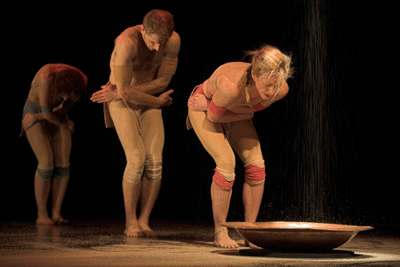 A színpad rendezői jobbján lavórnyi, csillogó fémtányér, erős megvilágításban: öblébe a magasból finom anyag szitál. Elsőre - ez kicsit érthető - rizsnek gondolja az ember, majd megtudakolja, hogy egy speciális homokról van szó, mely egy fellógatott henger apró nyílásán szivárog csillogón (Berger Gyula Bíbor sivatag című koreográfiájában látni több, ugyanilyen eszközt működés közben). A finom anyagot a táncosok később széles ívben szórják szét a színpadon - a kép izgalmas és emlékezetes.