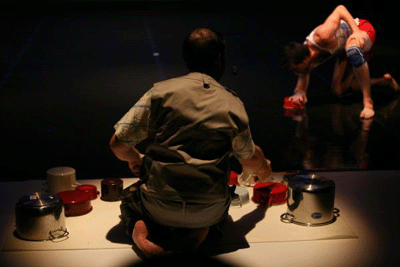 Ütős hangszerek és gyermekien érdeklődő ösztönteremtmények humoros kettőse "szólal" meg Horváth Csaba kísérleti darabjában. Kísérleti, mert megpróbálja a zenét tánc által megjeleníteni, ugyanakkor interaktív módon buzdítja a zenész-dobost a szokatlan, rendhagyó módon való játékra. Ez a folyamatos párbeszéd az érzelem és élményskála legkülönbözőbb pontjait megmozgatva képezi a darab vezérfonalát.